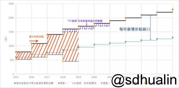 無奈之二是國家對清潔能源的補貼自2015年起,到2017年年底拖欠應達到1500億元,其中光伏補貼的缺口超過一半,且短期內無法解決缺口問題。光伏行業持續高速增長,考慮新能源發電補貼將持續20年,補貼金額每年疊加,欠補貼的缺口將越來越大,包袱將越來越重。 2017年初,為解決缺口,國家發改委、財政部和國家能源局聯合發布了《試行可再生能源綠色電力證書核發及自愿認購交易制度的通知》。綠證由國家可再生能源信息管理中心負責核發,每1000度綠電可獲得一個綠證,核發后可在中國綠色電力證書認購交易平臺出售,各級政府機關、企事業單位、社會機構和個人均可認購,以此來分擔國家對光伏及風電企業的補貼。然而綠證制度并非強制執行,而是采取自愿制度,由其他企業和個人決定是否購買,因此該制度還只是一個概念。 總之,光伏新政的實施確實可以減緩補貼缺口的加劇擴大(參見圖二),也可減輕并網消納的巨大壓力。