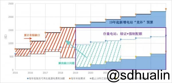 注:模型中,如果19年及以后新增電站全部采用“競補”規則,各年“競補”預算也從可再生能源電費附加中撥付(圖中標藍區域);剩余的電費附加額度(圖中綠色虛線組成的區域)用于償還累計缺口(紅線區域);模型建議自2019年起,存量電站的補貼(紫色大框內區域)由“綠證+強制配合”解決。另,再次說明,圖中數據僅作為趨勢參考。 建議一:新增電站:不限規模,限補貼金額 對現有集中式(領跑者和地面)及分布式的規模指標、分配方式及競價模式,轉變思路,改為根據可能的預算,量入而出,分配補貼金額,各省在補貼金額內由電站投資企業“競補”。如果國家沒有其他財政資金來源,仍可從可再生能源電費附加總額中提取(參見圖三)。 國家對新增電站年度總補貼預算規模,可根據上年度各省裝機規模、潛力、并網容量和消納等情況,將總補貼預算按塊塊切蛋糕,各省根據國家的切塊及省內配套補貼,由省內光伏電站投資企業競爭電價補貼。在滿足電站建設和并網消納基礎標準的前提下,將補貼優先分配給度電所需補貼低的企業,從最低排序直至省內預算用完,確保補貼到位,不再有任何拖欠。 顯然,無需補貼的企業始終能最先備案,不限制其規模。度電競補低的企業將以更高的概率獲得補貼并備案,從而,有限的補貼預算可以建設最大規模的電站,實現規模及效益最大化。 如此推行,一方面可將市場中建設成本高、資本實力弱、管理能力差的企業淘汰出局,競爭力強的企業才能最終獲勝;另一方面,各級政府相關機構不再糾纏于分配指標,尋租機會消失。競補低者得之,公開透明,童叟無欺。找市長沒用,競補低才有希望。 省內補貼預算亦可分成地面和分布式補貼預算兩個部分??紤]分布式項目度電成本稍高,更需要補貼推動發展,但補貼的方式可以相同,即競補低的優先獲得備案和補貼,而無需補貼的始終最先備案。 分布式光伏無需額外的土地,有利于屋頂資源及空間的多重利用,應鼓勵發展。政策層面應積極推廣分布式市場化交易,掃除政策和體制障礙。 風電包括海上風電、光熱、生物質發電等都可沿用這一機制,有利于技術領先、成本較低、管理高效的企業在市場上占先。無指標可分,“指標”市場消失,權力無需關進籠子中。 有人擔心,這是否會引起新一輪的惡性競爭?一是從企業角度,企業自負盈虧,應該相信企業會理性決策;二是從政府角度,可限定企業準入條件,設一定的門檻,如資本金等;三是從監管角度,如果競補成功后備案項目未能按時建設完成,企業將進入失信名單,限制其以后參與競補。 所以,只要政策設計得當,短期偶爾的惡性競爭可能會存在;長期來看,新增電站投資,一定由成本管控好,技術水平高、資金實力強的企業主導。企業會尋找光照條件好、就近消納易、屋頂或土地租金廉、地方稅金少、供應性價高、資金成本低、營商環境佳的地方進行選擇和投資??紤]投資企業競爭壓力大、利潤微薄,地方政府為了能源轉型、綠色生態和稅收增加,應該會和投資企業聯手,幫助企業控制成本,而不至于中途變卦,一旦電站建成,隨意增加各種稅費和租金。 建議二:存量電站:綠證與強制配額相結合,替代補貼 至2017年12月底,全國存量光伏發電裝機規模已超過130GW,這些電站還需要連續補貼15-20年。隨著電站建設每年的疊加,每年補貼的總額也在累積,預估20年后才到補貼的峰值(參見圖二的補貼缺口)。在每年收取的可再生能源電費附加金額增長緩慢的情況下(參加圖二的藍色虛線),補貼欠賬越來越多,包袱越來越重?!?31新政”只是稍微減輕,不治標更不治本(參見圖二中新政減少的補貼金額)。解決存量電站的補貼,可行的辦法只有推行電力綠色證書及火電企業新能源強制配額相結合,化解補貼資金捉襟見肘之窘境(參見圖三)。 綠證市場比起碳市場更具現實性和可操作性,與火電企業強制性的可再生能源配額配合,存量光伏電站企業通過出售電力綠色證書得到收入,全面替代國家承諾但需漫長等待的補貼。 目前已進行的綠證市場交易中存在兩大問題,一是尚未強制實行可再生能源的配額制,完全依靠企業的環保意識、責任意識,其象征意義大于實際意義,綠證市場很難有所發展。三部委已提出將在2018年適時啟動綠證配額及強制交易,進一步完善綠證交易機制。就目前新能源補貼缺口巨大的約束下,應當及早啟動“兩政”疊加。二是風電、光伏綠證認購比例嚴重失調,光伏綠證競爭力差,許多光伏企業不愿意降低對價,導致銷售量遠低于風電綠證。 在 “531新政”下,光伏企業應當把握好綠證的機會,平衡價格與綠證銷售數量之間的關系,取代補貼需求。在將來綠證強制規范中,在配額里對風電和光伏分別設定比例,增加光伏綠證的銷售。 國際上,綠證交易已成為一套成熟的、靈活的清潔能源市場機制,它不僅可以通過對發電企業進行配額考核,還可以考核售電企業的綠色電力出售情況,由市場化機制將補貼壓力轉移給煤發電企業及用電終端。需要明確的是,可再生能源配額及綠色證書應該也必須直接量化給發電企業,如果按“塊塊”分配,企圖通過各級政府的行政手段,可能既扭曲交易市場,又滋生尋租機會。 有人懷疑,是否會大幅增加火電企業的轉型成本,并最終由消費者買單?根據現有風電、光伏、光熱、生物質等新能源發電補貼的存量規模,每年預計需要1000-1200億元的補貼,這一補貼
